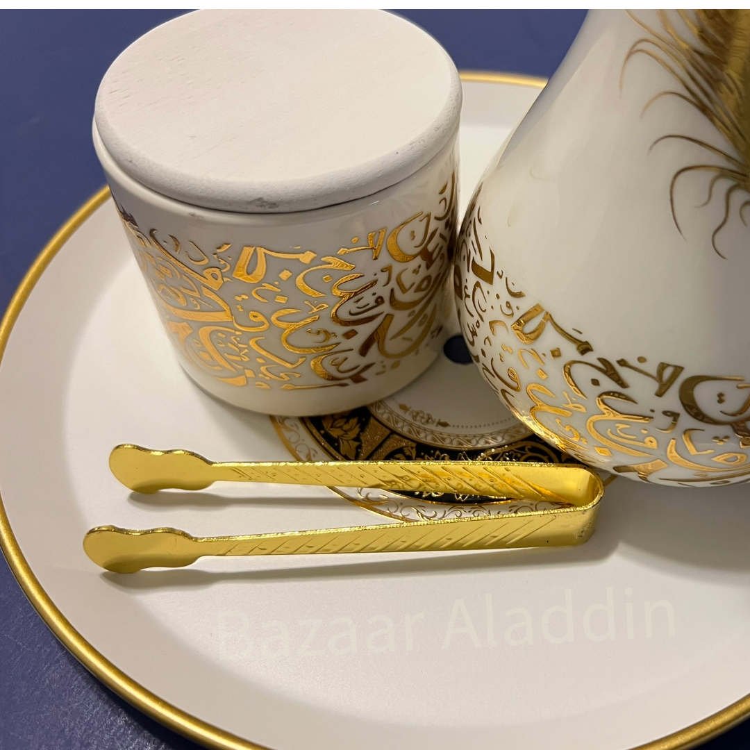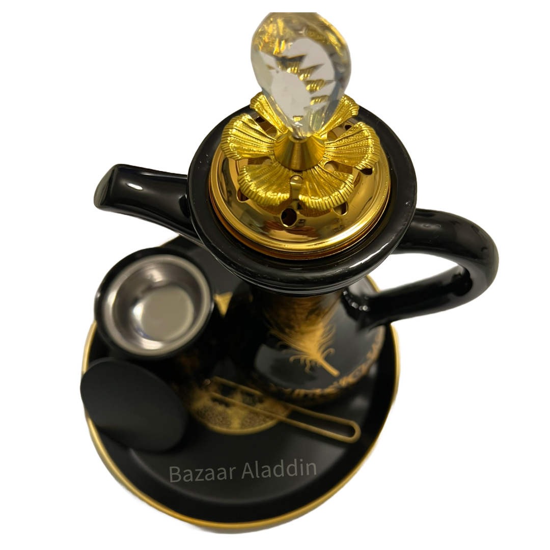 This elegant incense burner, shaped like a traditional Dalla (Arabic coffee pot), brings a touch of cultural heritage and sophistication to your space. Crafted from high-quality material, it features a glossy black finish with intricate golden patterns, including a striking feather design on its body. The lid is adorned with a crystal-like handle, adding a luxurious flair. Included is a matching plate and a beautifully designed tong for handling the incense. Perfect for adding a blend of tradition and elegance to your home decor, this burner is ideal for any occasion, offering both function and artistry.