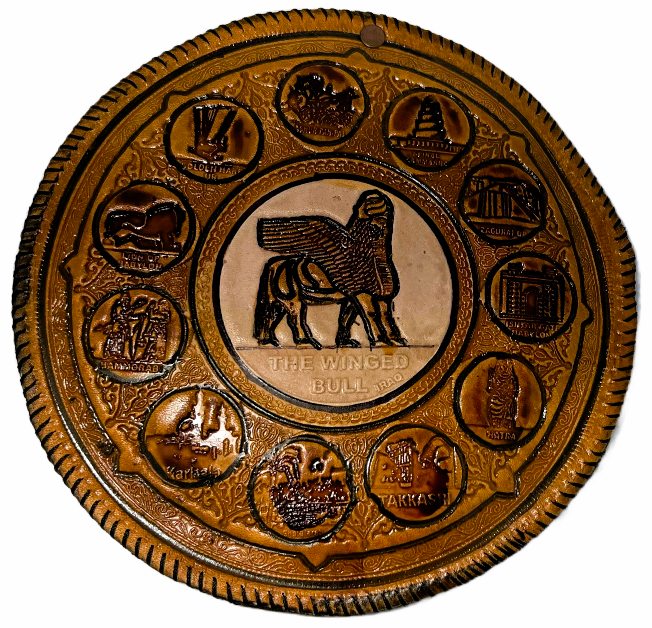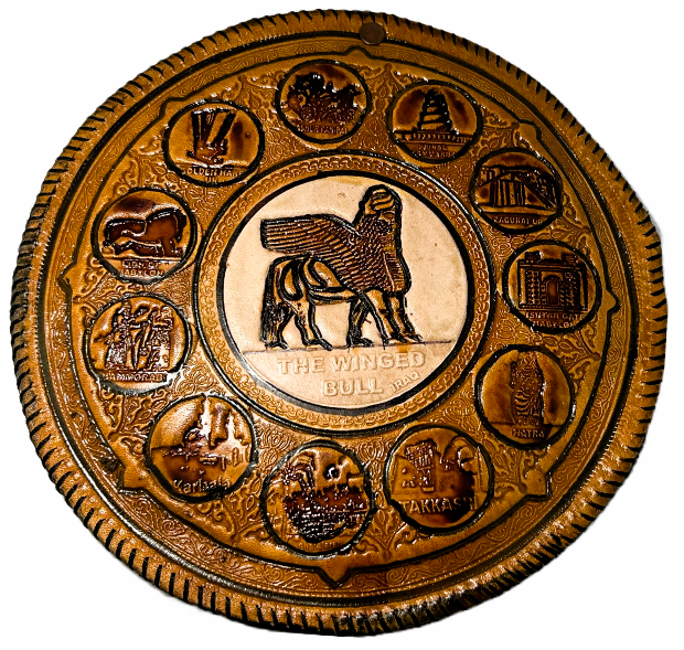 Lamassu surrounded by symbols of the Iraq civilizations. جلد طبيعي